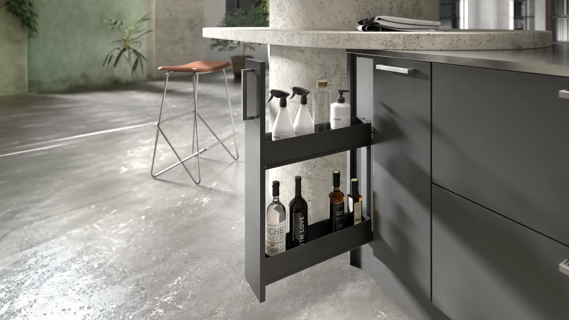 Os cestos para garrafas Lario, da Hettich, são a solução de qualidade alemã para aproveitamento de espaço com arrumação inteligente. Disponível em diversos acabamentos, medidas e versões, o seu acabamento antracite é exactamente igual ao acabamento antracite das gavetas AvanTech YOU e InnoTech Atira, providenciando um acabamento homogéneo e uniforme na sua cozinha.