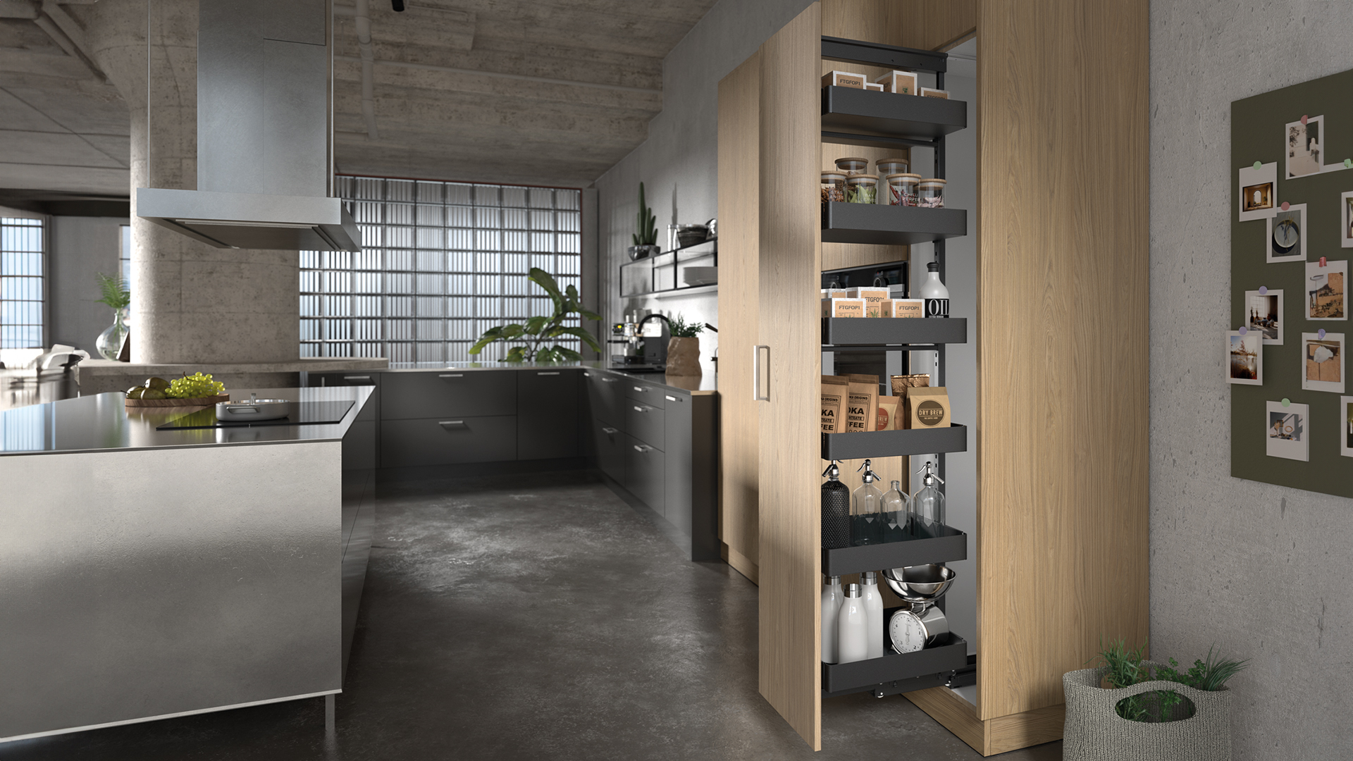 Coluna de cestos despenseiros Olona A coluna de cestos despenseiros Olona, da Hettich, é a solução de qualidade alemã para os móveis altos. Com amortecimento na abertura e no fecho, o seu acabamento antracite é exactamente igual ao acabamento antracite das gavetas AvanTech YOU e InnoTech Atira, providenciando um acabamento homogéneo e uniforme na sua cozinha.