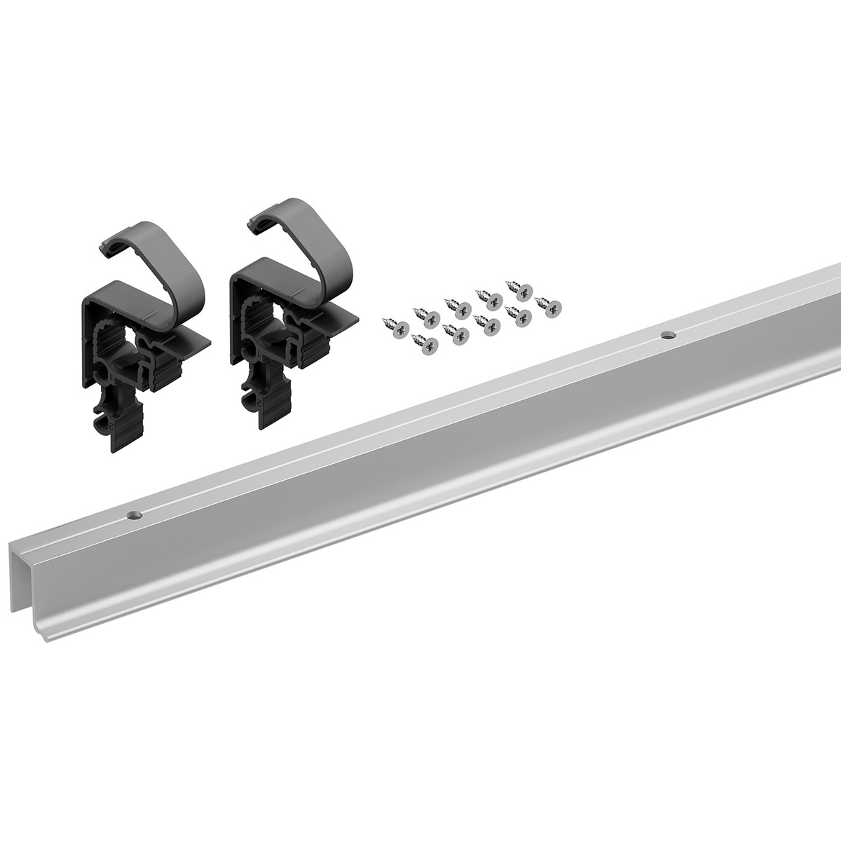 O conjunto é composto por um perfil de rolamento em alumínio com as posições de fixação pré-furadas, material de fixação e auxiliares de montagem de perfis