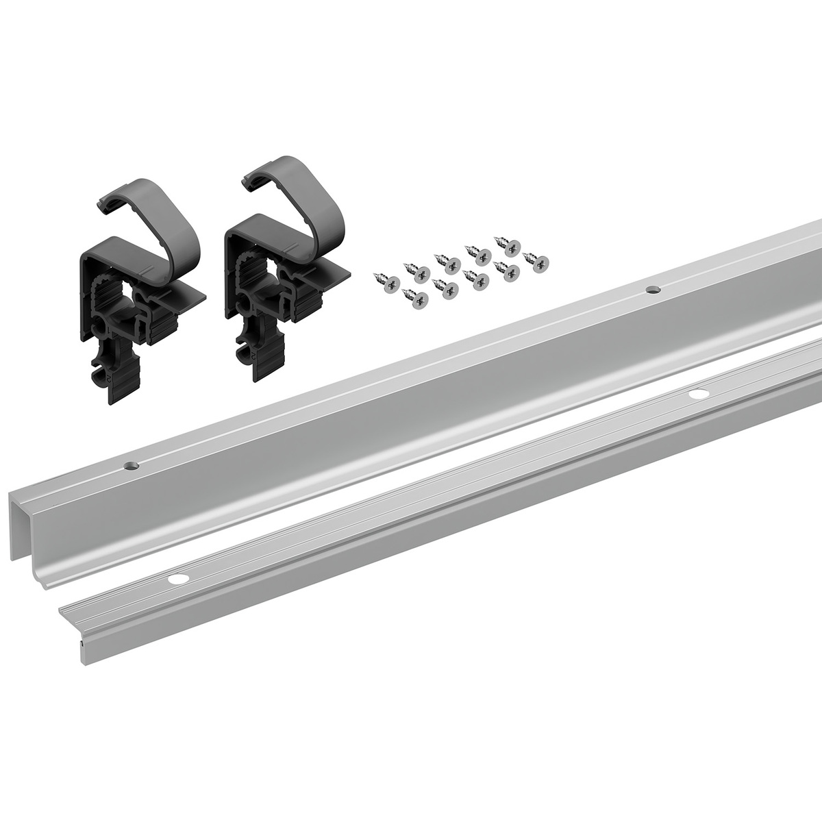 O conjunto é composto por um perfil de rolamento e um perfil de guia em alumínio com as posições de fixação pré-furadas, material de fixação e auxiliares de montagem de perfis