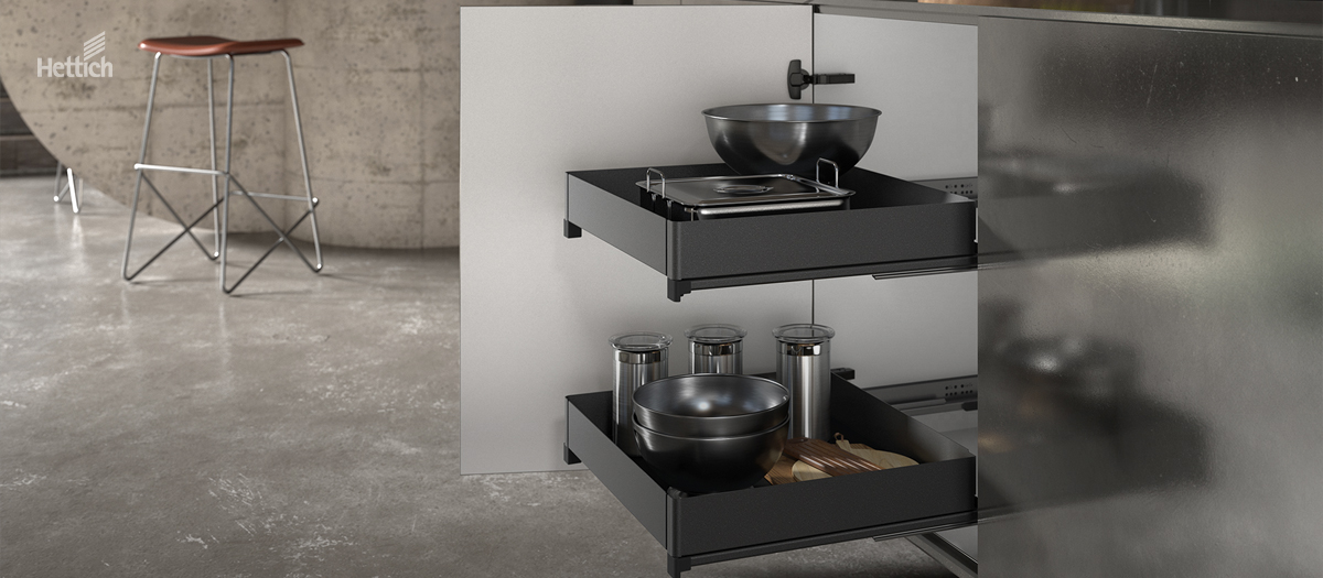 Sistema de pés niveladores, deslizadores, suportes de rodapé e outros acessórios Capacidade de carga por pé 450 kg, no máx. 1350 kg com 3 ou mais pés Fixação segura do pé nivelador no deslizador durante a instalação e deslocação do armário Grande superfície de apoio de ø 78 ou 80 mm Regulação simples da altura Gaveta de rodapé possível a partir de 150 mm de altura plástico preto