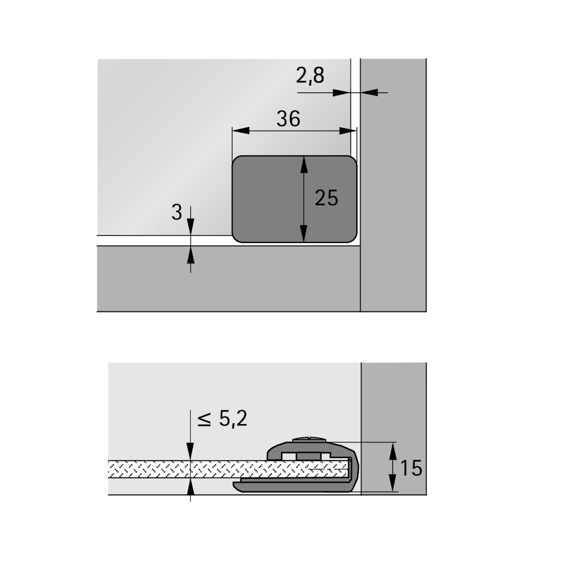 - - Largura = largura interior do corpo do móvel - 5,6 mm