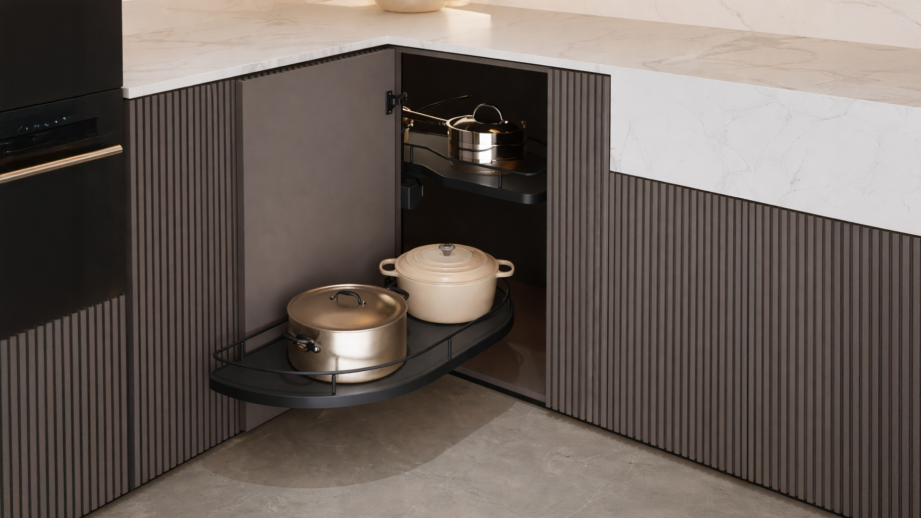 O cesto deslizante Dolphin Compact em Antracite é ideal para optimizar o espaço em móveis de canto em projectos de cozinha. Permite acesso total ao conteúdo, tem um design robusto e elegante, com alta capacidade de carga, e é adaptável a várias larguras. Um sistema prático e duradouro que torna útil cada canto.
