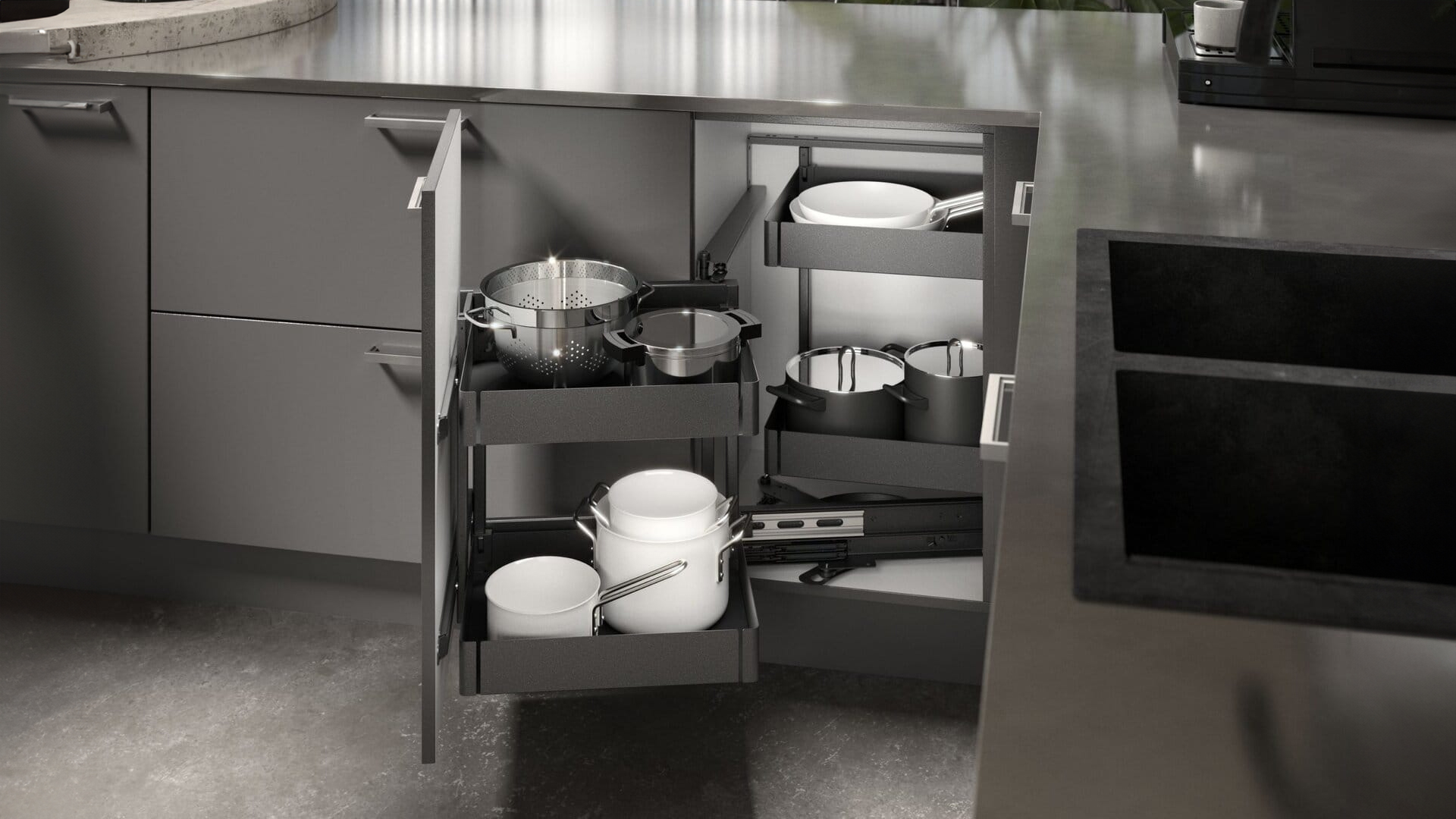 Os cestos articulados Goro para móveis de canto, da Hettich, são a solução de qualidade alemã para um acesso fácil e rápido em móveis de canto. Com movimento sincronizado com a abertura da porta, o seu acabamento antracite é exactamente igual ao acabamento antracite das gavetas AvanTech YOU e InnoTech Atira, providenciando um acabamento homogéneo e uniforme na sua cozinha.