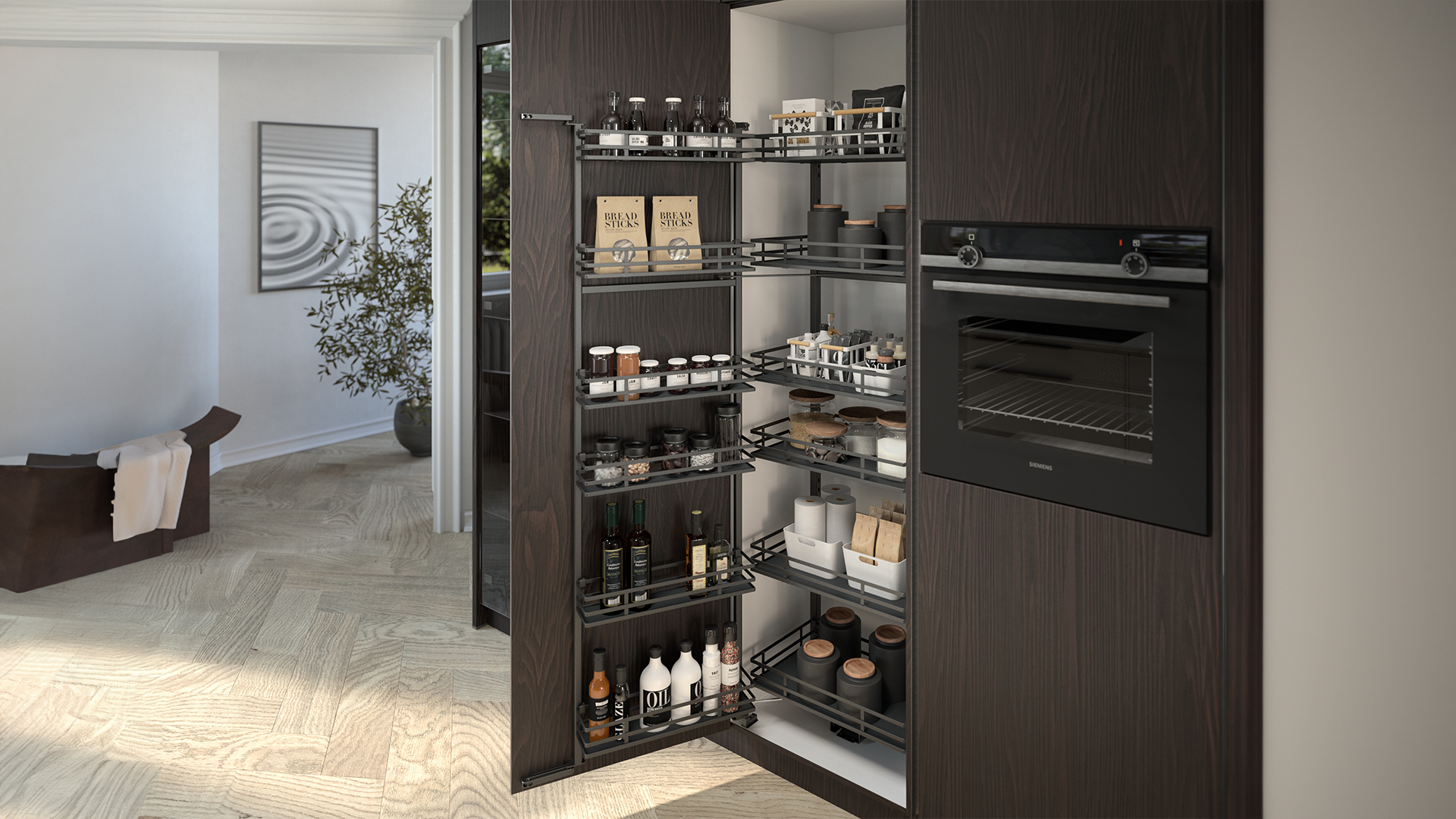 A coluna de cestos Iseo, da Hettich, é a solução de qualidade alemã para os móveis de coluna. Com cestos no interior do móvel que são extraídos gentilmente com a abertura da porta e com cestos na própria porta, combina um excelente aproveitamento de espaço com enorme ergonomia.