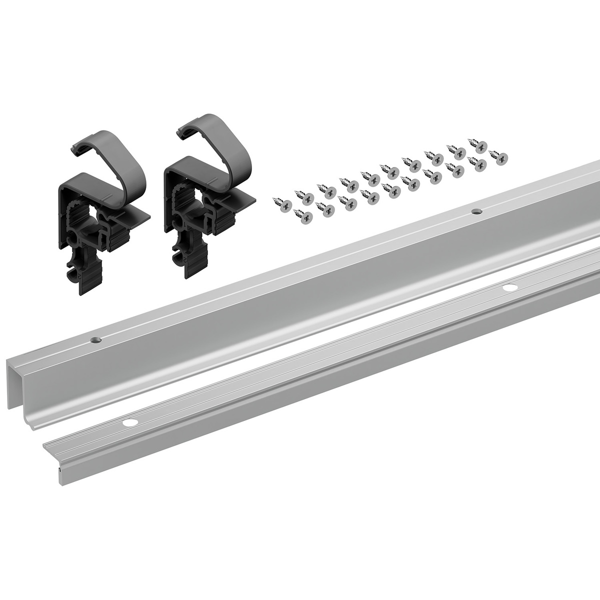 O conjunto é composto por um perfil de rolamento e um perfil de guia em alumínio com as posições de fixação pré-furadas, material de fixação e auxiliares de montagem de perfis