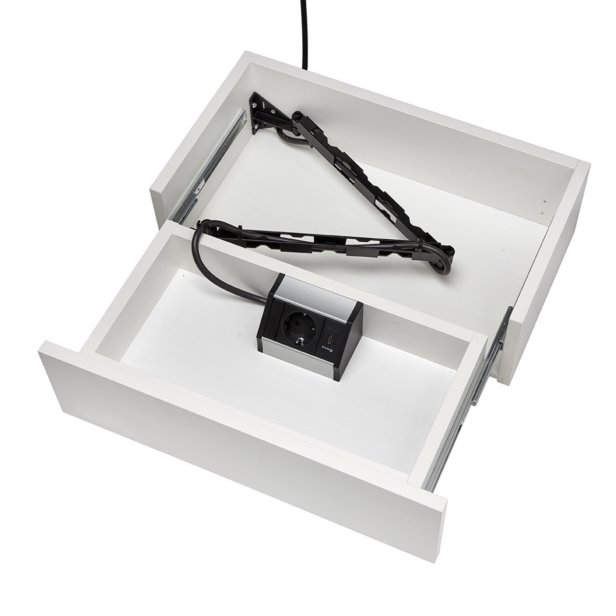 Uma solução discreta, elegante e segura para integrar alimentação eléctrica no interior de gavetas — perfeita para cozinhas, casas de banho ou áreas de trabalho.